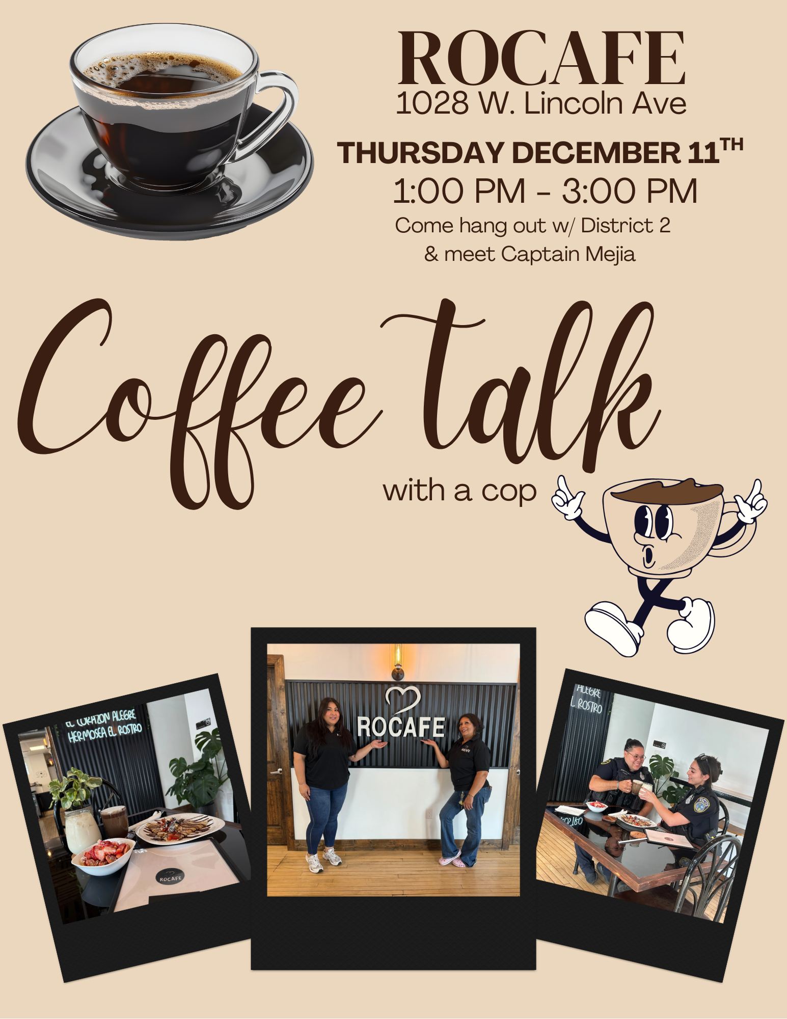 Si te perdiste nuestro último café con la policía, no te preocupes, ¡por suerte tendremos otro evento! Ven a relajarte y disfrutar de un café con nosotros en RoCafe la próxima semana, Jueves 11 de Decembre, de 1:00 PM- 3:00PM.
