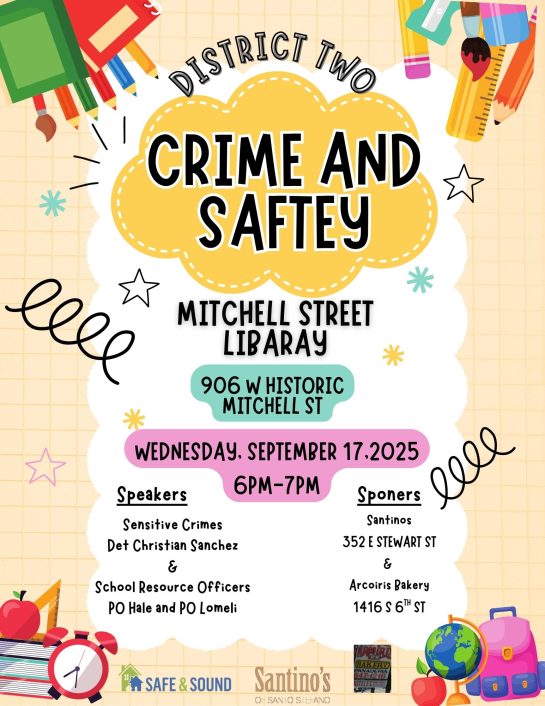 District 2 - Crime and Safety Meeting District 2 - Crime and Safety Meeting 6:00 pm – 7:00 pmSeptember 17, 2025 Milwaukee Public Library (Historic Mitchell)906 W. Historic Mitchell St. Milwaukee, WI 53204View LocationMap Milwaukee Public Library (Historic Mitchell) iCal Google View full calendar