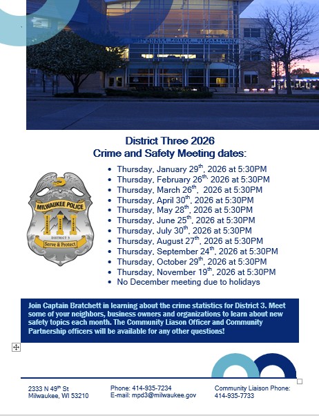 Join Captain Bratchett in learning about the crime statistics for District 3. Meet some of your neighbors, businss owners and organizations to learn about new safety topics each month. The Community Lieason Officer and Community Partnership Officers will be available for any other questions.