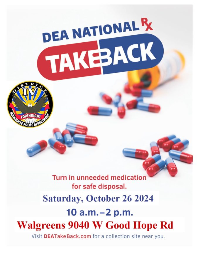 District 4 - RX Take-Bake District 4 - RX Take-Bake 10:00 am – 2:00 pmOctober 26, 2024 Walgreens (Good Hope Rd)9040 Good Hope Rd.Milwaukee, WI 53224View LocationMap Walgreens (Good Hope Rd) iCal Google View full calendar