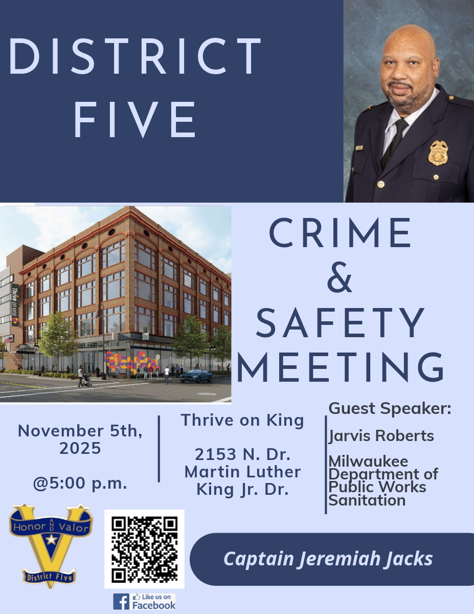 District 5 - Crime and Safety Meeting District 5 - Crime and Safety Meeting 5:30 pm – 7:00 pmNovember 5, 2025 Mark your calendars and #JoinUs Thrive on King 2153 N. Martin Luther King Jr. Dr. Milwaukee, WI 53212View LocationMap Thrive on King iCal Google View full calendar