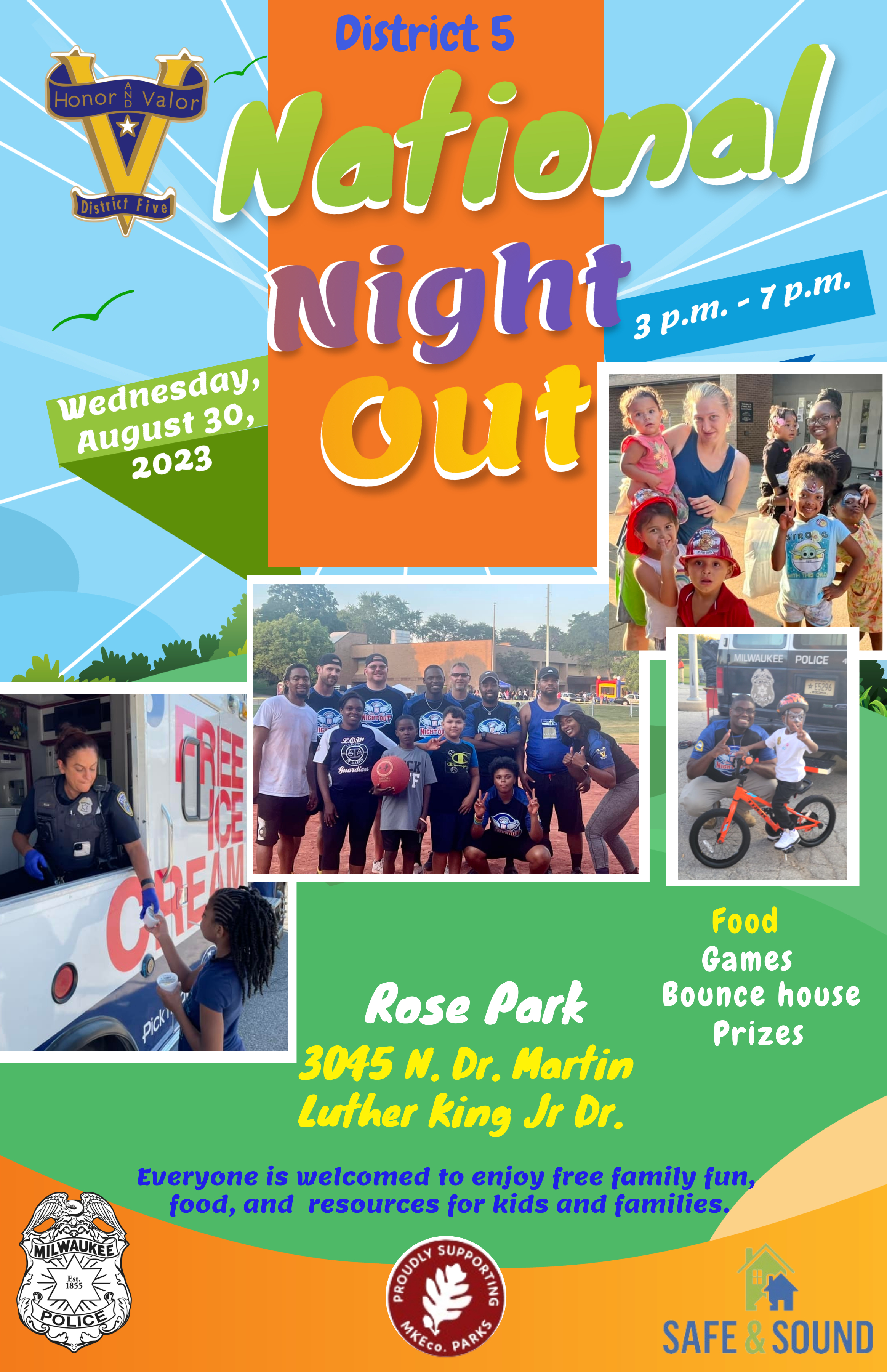 District 5 - National Night Out 3:00 pm – 7:00 pmAugust 30, 2023 Clinton Rose Park 3045 N. Dr Martin L. King Jr. Dr.Milwaukee, WI 53212View LocationMap Clinton Rose Park iCal Google View full calendar