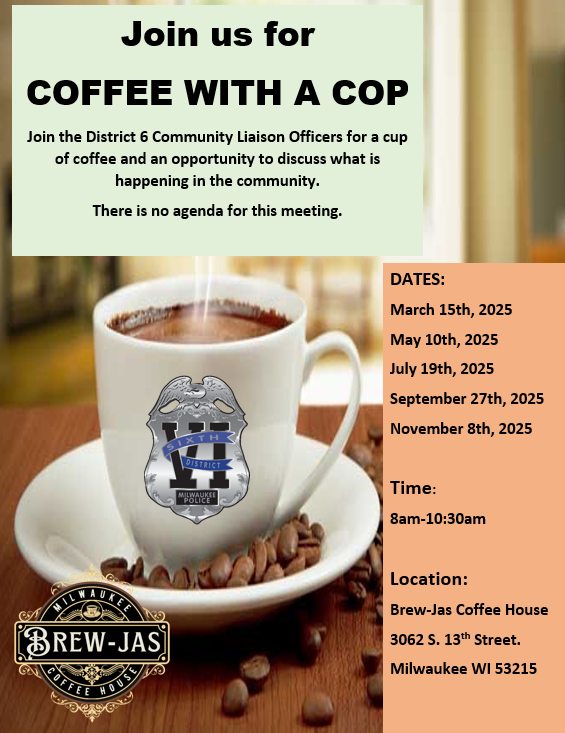 Every month District 6-Will be hosting a Coffee with a Cop event. Please check the dates and locations and join your District 6 Officers for some coffee and have a discussion of what is happening in the community. Special Thanks to Brew-Jas Coffee House and McDonalds for hosting the events.