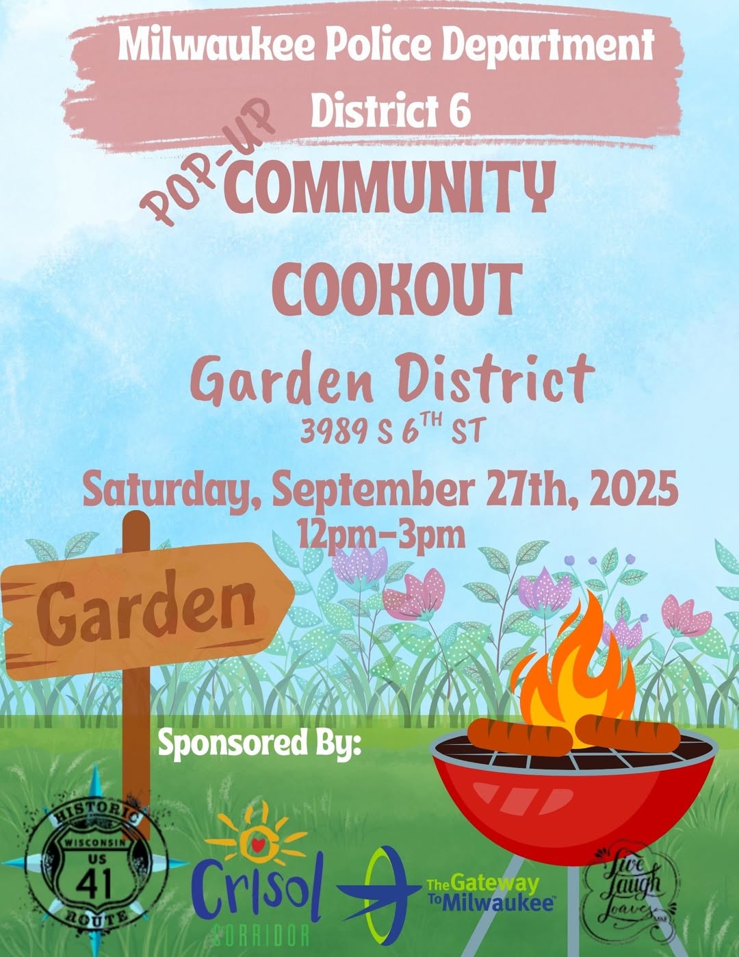 #MKEPD Come join District 6 for this Pop Up Community CookOut at the Garden District garden this Saturday. Bring a chair and we hope to see you there. 🌭🍔🚔🥤