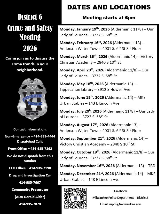 District 6 - Crime and Safety Meeting 6:00 pm – 7:00 pmJanuary 19, 2026 Join Us iCal Google Calendar View full calendar