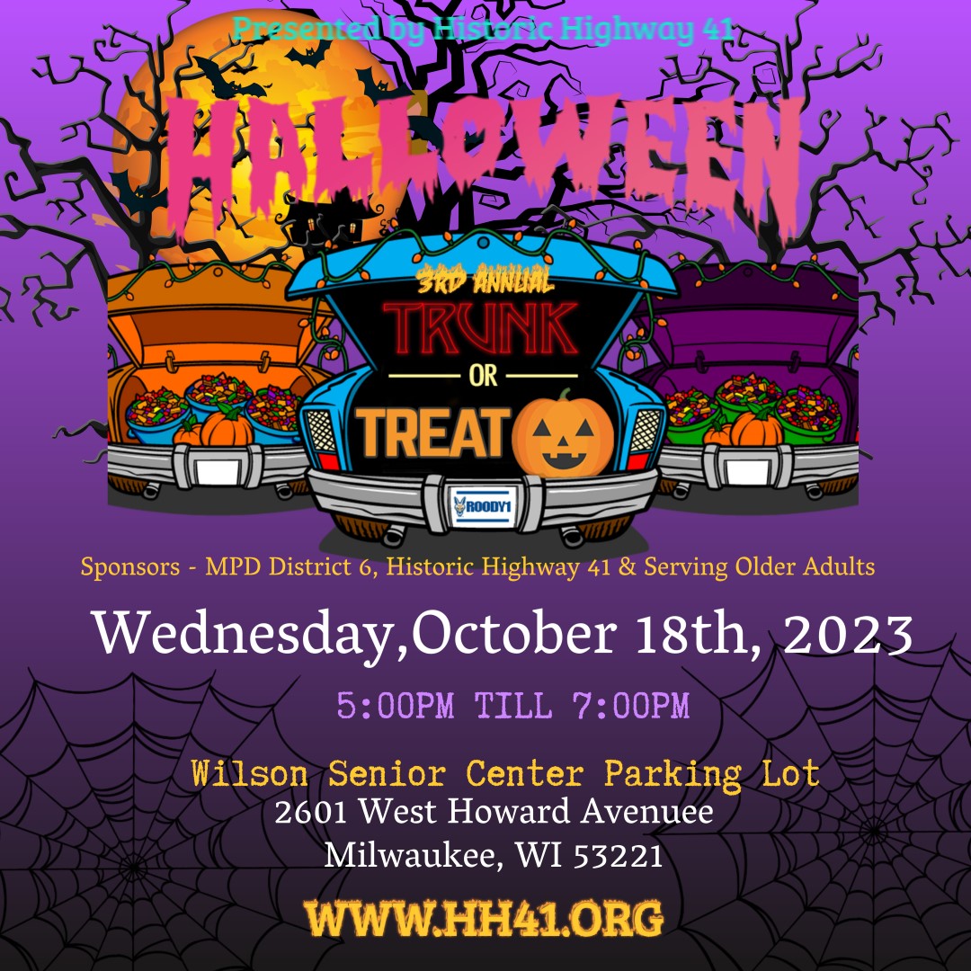 District 6 - Halloween Trunk or Treat District 6 - Halloween Trunk or Treat 5:00 pm – 7:00 pmOctober 18, 2023 Wilson Senior Center 2601 W. Howard Ave.Milwaukee, WI 53221View LocationMap Wilson Senior Center iCal Google View full calendar