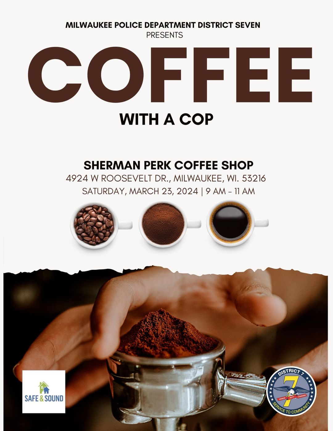 District 7 - Coffee with a Cop District 7 - Coffee with a Cop 9:00 am – 11:00 amMarch 23, 2024 Sherman Perk 4924 W. Roosevelt Dr. Milwaukee , WI 53216View LocationMap Sherman Perk iCal Google View full calendar