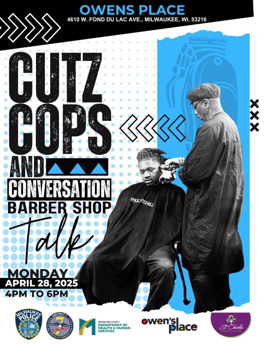 District 7 - Cutz Cops and Conversation Barber Shop District 7 - Cutz Cops and Conversation Barber Shop 4:00 pm – 6:00 pmApril 28, 2025 Join us! Owen's Place4610 W Fond Du Lac Ave.Milwaukee, WI 53216View LocationMap Owen's Place iCal Google View full calendar