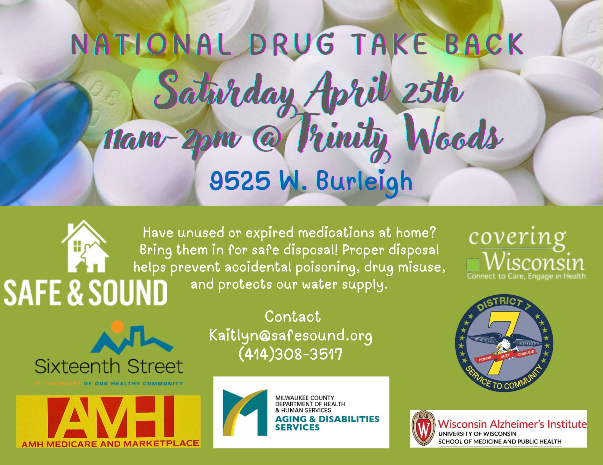 District 7 - Drug Take Back 11:00 am – 2:00 pmApril 25, 2026 Have unused or expired medications at home? Bring them in for safe disposal. Trinity Woods9525 W. Burleigh Milwaukee , WI 53222View LocationMap Trinity Woods iCal Google View full calendar