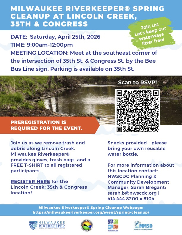 Meet at the Bee Bus Line sign to help clean up trash and debris along Lincoln Creek and near MMSD's West Basin to keep our neighborhood and environment clean and beautiful. Milwaukee Riverkeeper® provides bags, gloves, cleanup supplies, and free T-shirts, plus snacks will be available! The event host will happily sign off on any required community service/volunteer hours.