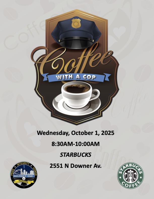 District One -Coffee with a Cop 8:30 am – 10:00 amOctober 1, 2025 Starbucks (District One)2551 N. Downer Ave. Milwaukee , WI 53211View LocationMap Starbucks (District One) iCal Google View full calendar