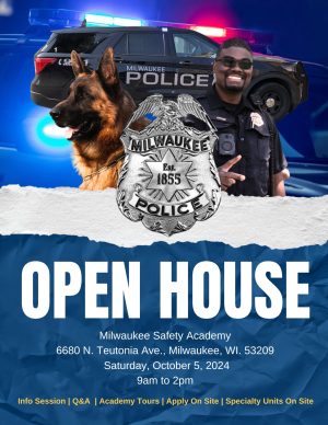 Milwaukee Police Open House Milwaukee Police Open House 9:00 am – 2:00 pmOctober 5, 2024 Milwaukee Police Academy6680 N Teutonia AveMilwaukee, WI 53209View LocationMap Milwaukee Police Academy iCal Google View full calendar