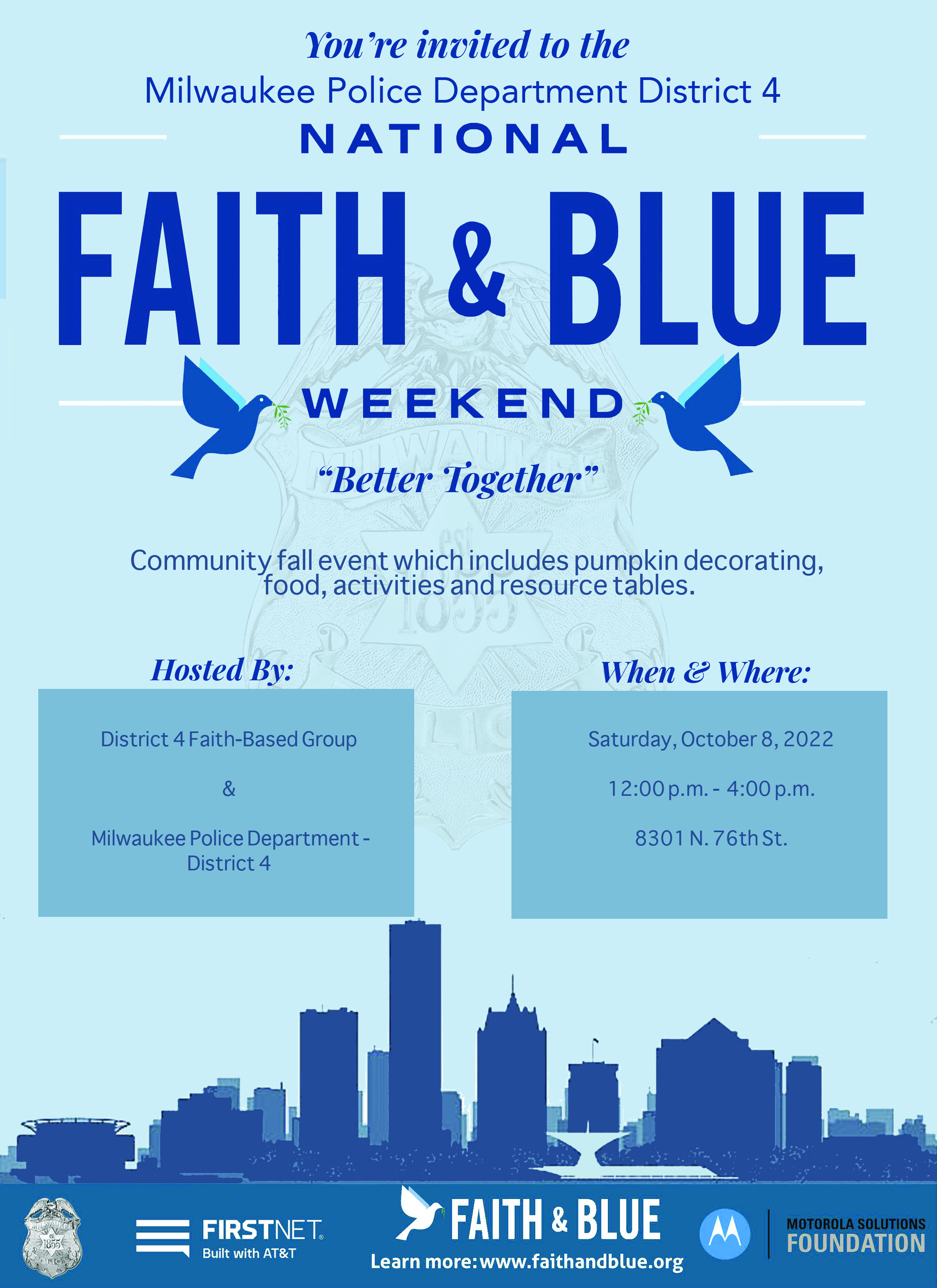 In honor of National Faith & Blue Weekend, Community fall event which includes pumpkin decorating, food, activities and resource tables.