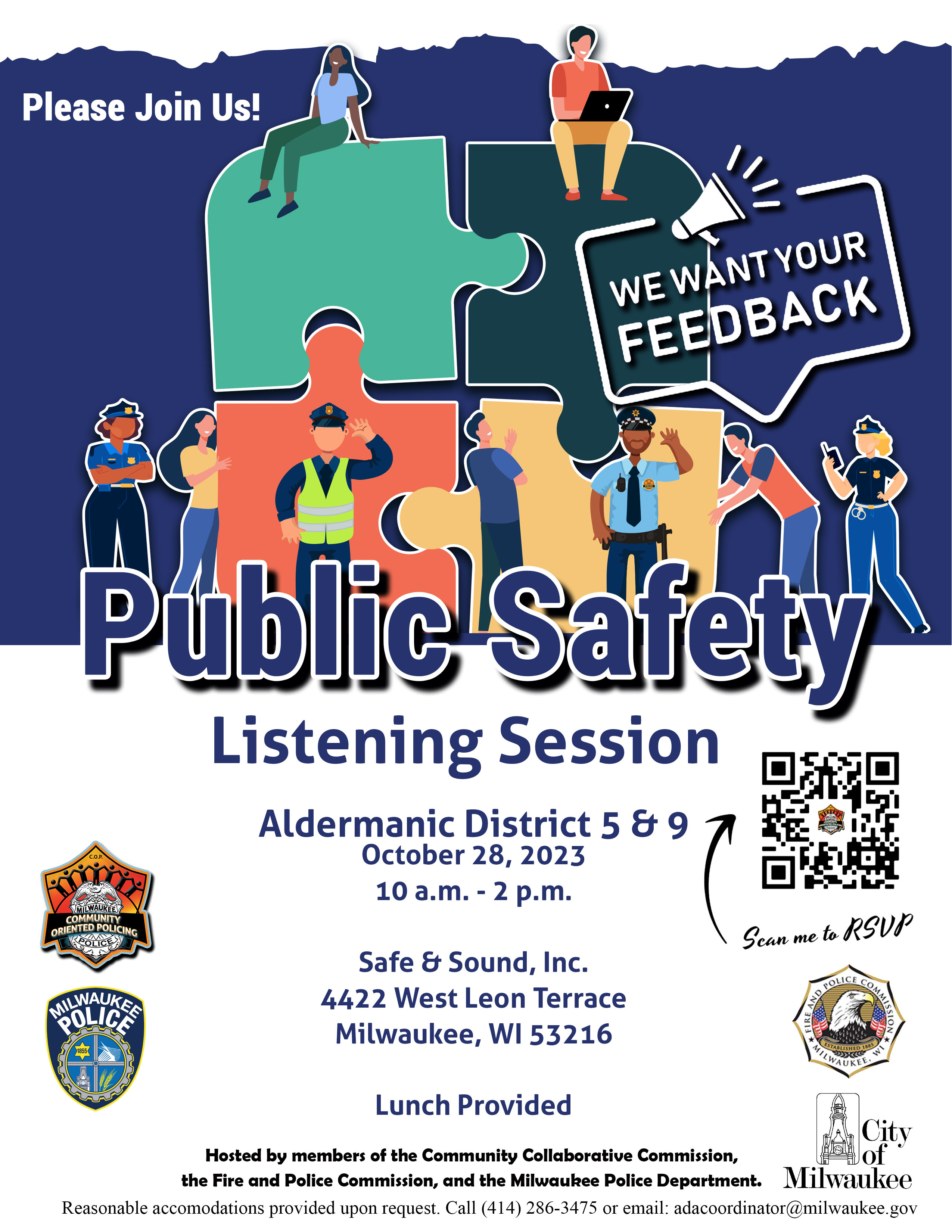 The Milwaukee Police Department, in partnership with the Community Collaborative Commission, the City of Milwaukee Office of Violence Prevention, the Fire & Police Commission - MKE and the Mayers Strategic Solutions, LLC. has worked actively to create a process to reimagining public safety by developing a citywide plan. However, we need collaboration and input from the community. Please join us in a solution driven discussion on the development of this effective and comprehensive community engagement plan. Collectively let’s reimagine public safety together.