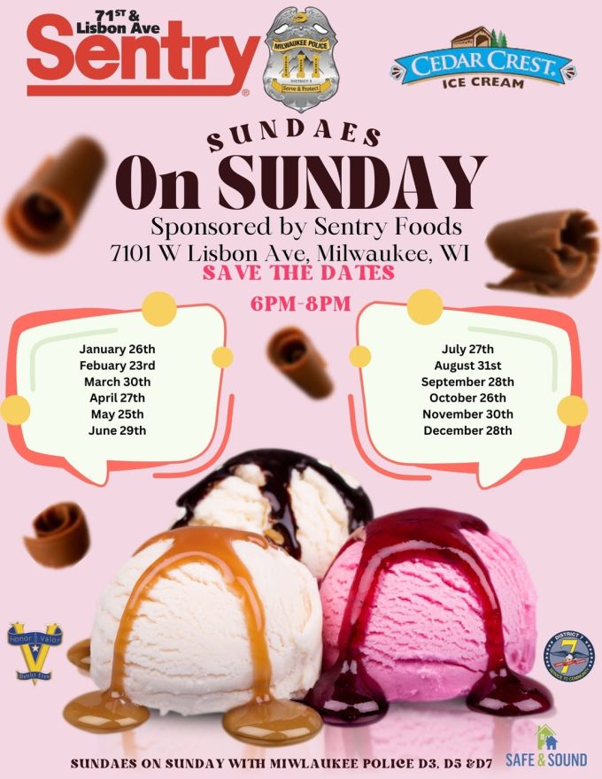 Sundaes on Sunday Sundaes on Sunday 6:00 pm – 8:00 pmDecember 28, 2025 Sentry Foods 7101 W. Lisbon AveMilwaukee, WI 53210View LocationMap Sentry Foods iCal Google View full calendar